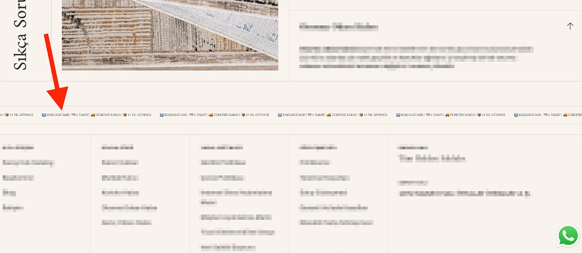 Yazılar sağdan sola doğru kayıyor. Ok ile gösterdiğim yerde KOŞULSUZ İADE | 6 TAKSİT | ÜCRETSİZ KARGO | 53 YIL GÜVENCE yazıları var. Bu tür kayan yazılarda sonsuz döngü olduğu için, font boyutlarının da çok küçük olmasından dolayı aynı yazılardan birden fazla görüyorsunuz.