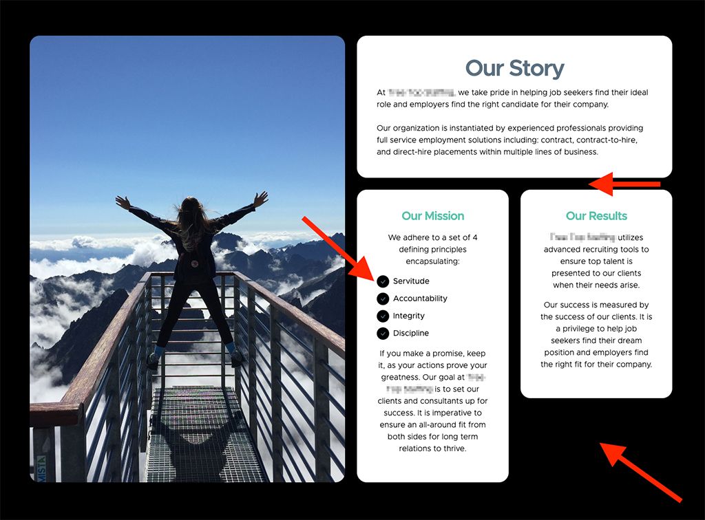 Üstteki ekran görüntüsünde paylaştığım web sitede sağdaki yazıların olduğu bölüm, dikkat çekmesi gereken bölüm olmasına rağmen oraya daha küçük yer ayrılmış. Yazı bölümü görsele oranla ortalanmamış ve görsel-başlık-yazı-buton arasında yeterli boşluk bırakılmamış.