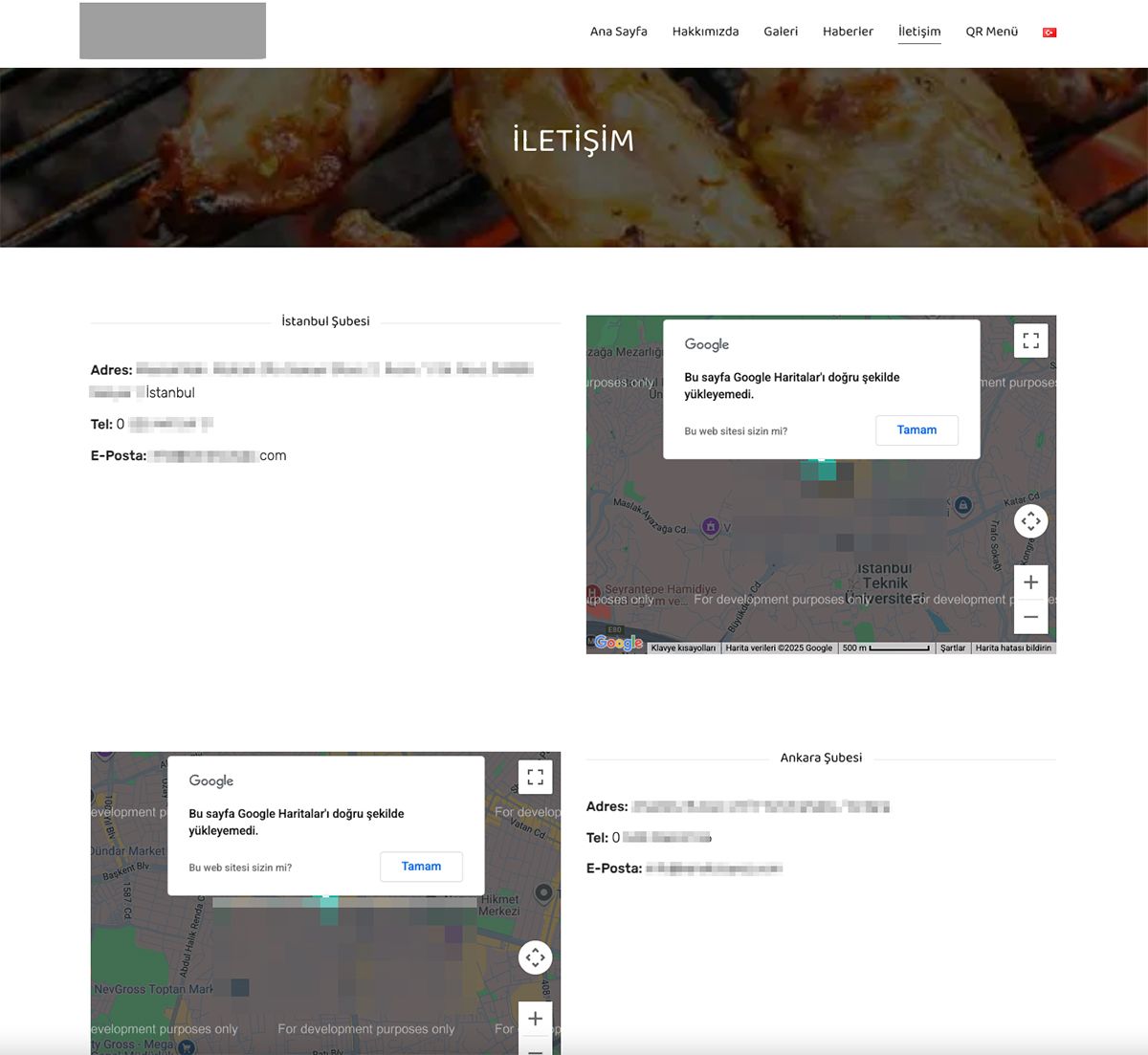 Fakat yeni açılan şubenin adresini öğrenmek isteyip İletişim sayfasına girdiğimde Google Haritalar API hatası ile karşılaştım.